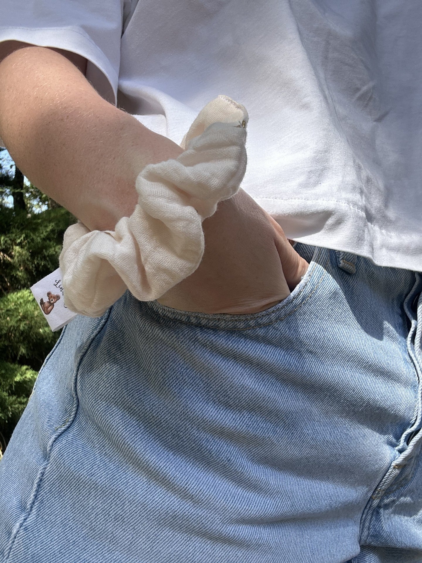 Ce chouchou en gaze de coton apporte une touche de style simple et élégante à vos coiffures.